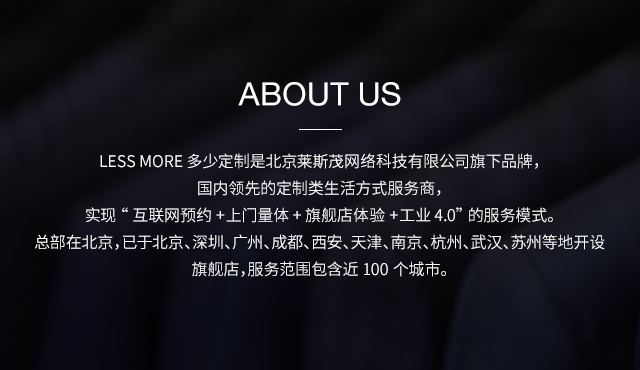 LESS MORE多少定制 2015年5月創(chuàng)立于北京,以互聯(lián)網思維和工業(yè)4.0切入服裝定制領域,獨創(chuàng)“互聯(lián)網預約+旗艦店體驗+免費上門量體+工業(yè)4.0 C2M生產”的模式,現(xiàn)已成為國內服裝定制行業(yè)的標桿品牌。